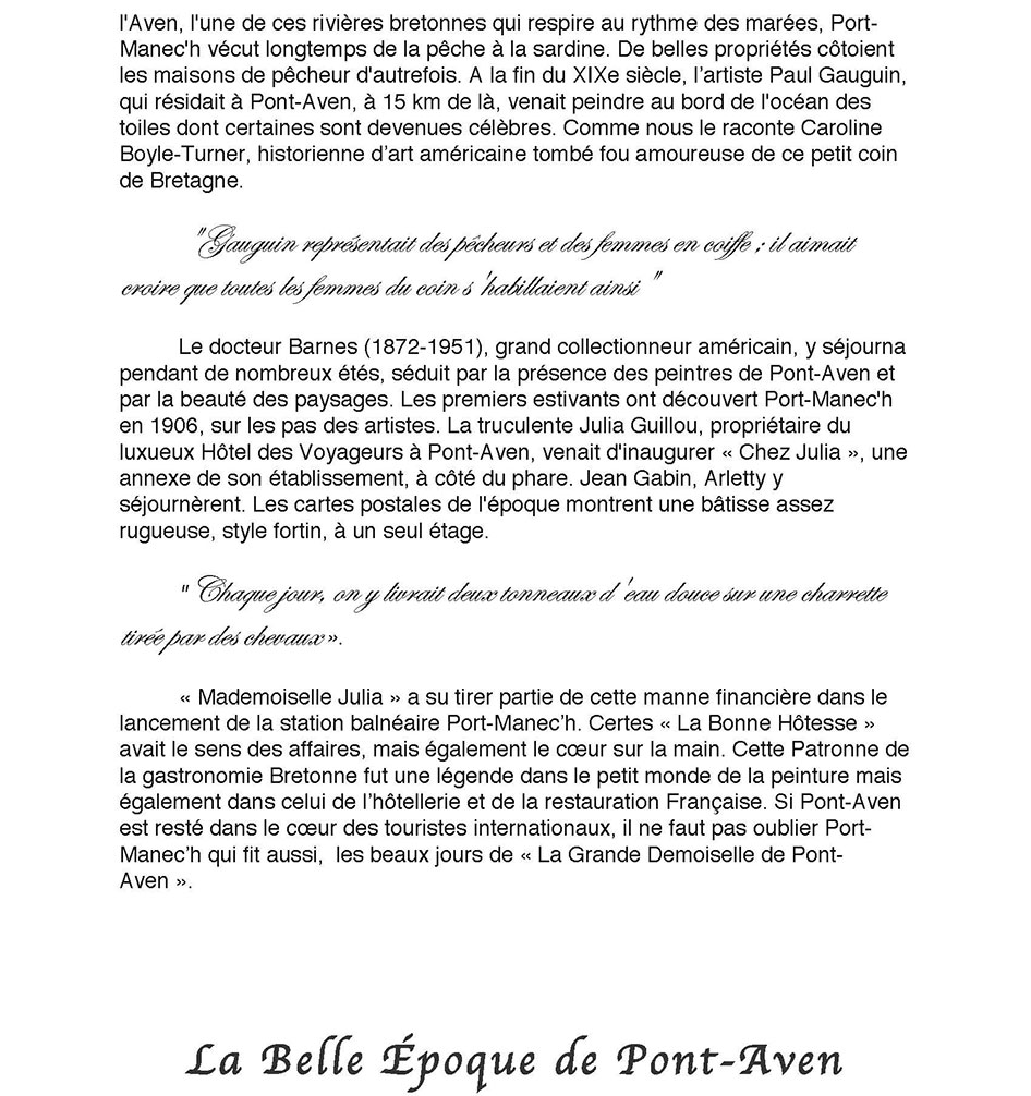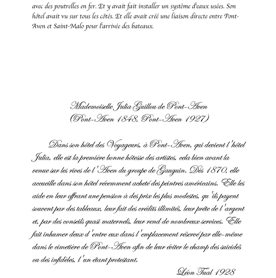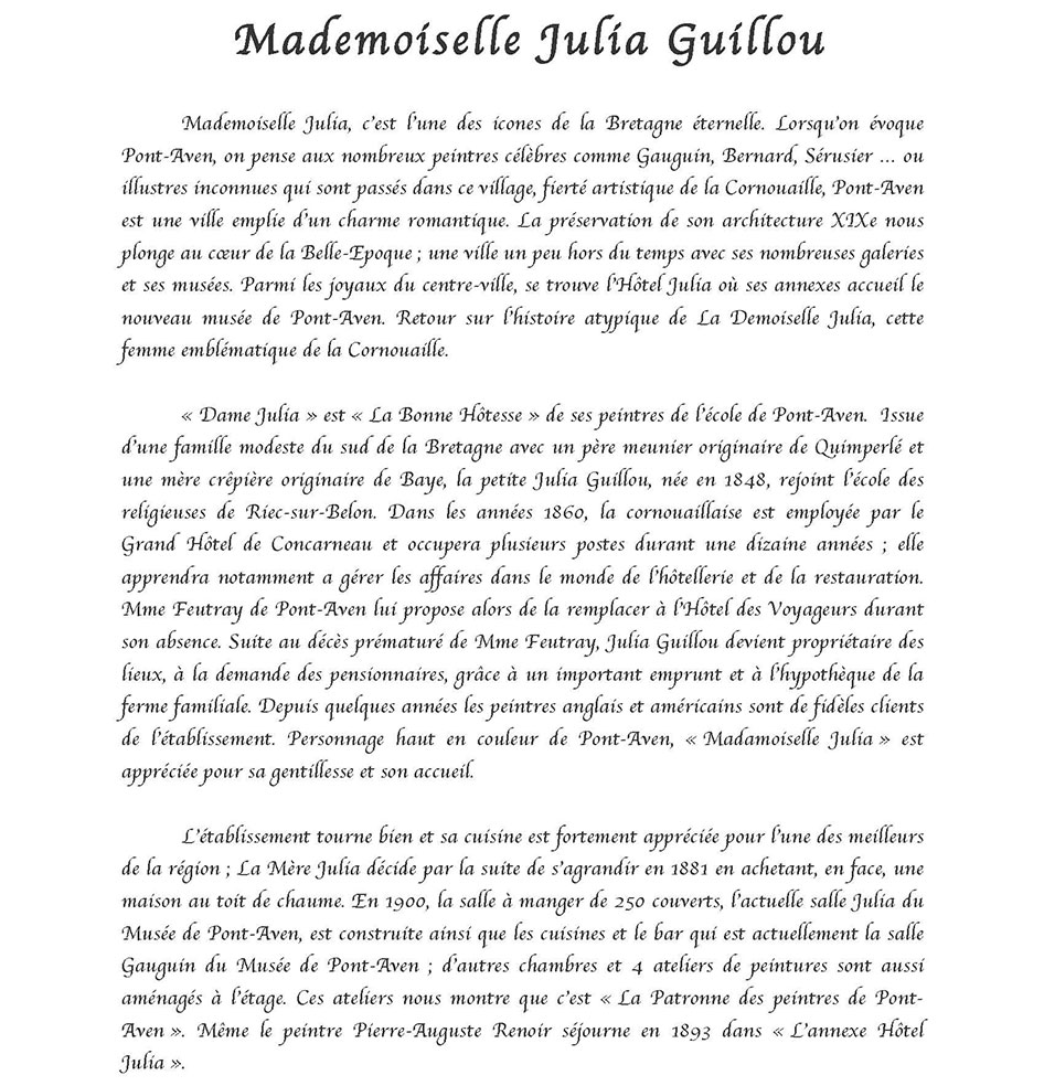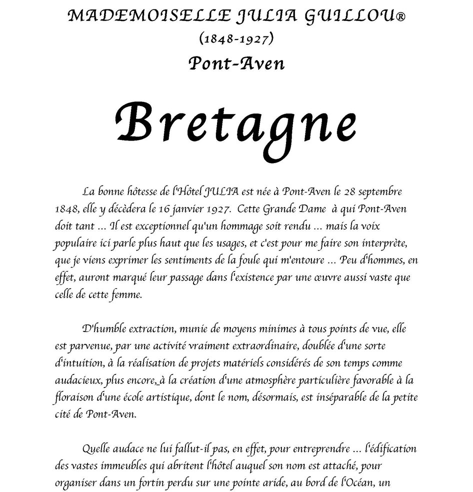 MADEMOISELLE JULIA GUILLOU® (1848-1927) Pont-Aven Bretagne La bonne hôtesse de l'Hôtel JULIA est née à Pont-Aven le 28 septembre 1848, elle y décèdera le 16 janvier 1927. Cette Grande Dame à qui Pont-Aven doit tant … Il est exceptionnel qu'un hommage soit rendu … mais la voix populaire ici parle plus haut que les usages, et c'est pour me faire son interprète, que je viens exprimer les sentiments de la foule qui m'entoure … Peu d'hommes, en effet, auront marqué leur passage dans l'existence par une œuvre aussi vaste que celle de cette femme. D'humble extraction, munie de moyens minimes à tous points de vue, elle est parvenue, par une activité vraiment extraordinaire, doublée d'une sorte d'intuition, à la réalisation de projets matériels considérés de son temps comme audacieux, plus encore, à la création d'une atmosphère particulière favorable à la floraison d'une école artistique, dont le nom, désormais, est inséparable de la petite cité de Pont-Aven. Quelle audace ne lui fallut-il pas, en effet, pour entreprendre … l'édification des vastes immeubles qui abritent l'hôtel auquel son nom est attaché, pour organiser dans un fortin perdu sur une pointe aride, au bord de l'Océan, un établissement modèle, noyau de la cité balnéaire dont personne, à cette époque n'aurait imaginé le magnifique développement. C'est qu'elle était douée d'une intelligence ouverte, susceptible de s'assimiler une foule de connaissances, comprenant tous les besoins, capable de s'accommoder à toutes les circonstances, servie par une volonté toute bretonne, une puissance de travail inimaginable pour qui ne l'a pas vue à l'œuvre. Ah! Certes, l'industrie hôtelière possédait là un de ses représentants les plus dignes, un de ceux qui font le bon renom d'un pays et par suite sa prospérité. Aussi, de tous côtés, dans la région bretonne, dans toute la France, à l'étranger, sa réputation s'était-elle rapidement répandue, et l'on accourait à la bonne hôtellerie, où l'on était assuré de trouver tout ce qui peut contribuer au charme d'une villégiature reposante et confortable. Les familles, avec leurs enfants, y venaient goûter la douceur de la période des vacances; les étrangers y affluaient, sûrs d'y trouver une hospitalité vraiment cordiale, et nous avons vu certains y prolonger leur séjour jusqu'au point de d'y oublier leur existence entière. Parmi les hôtes que Mlle Julia sut retenir à Pont-Aven, il faut faire une place spéciale aux artistes-peintres. Tous savent le rôle qu'elle a pris dans le développement de cette école qui compte tant d'artistes aujourd'hui. Quelques-uns savent sa générosité à l'égard de ces travailleurs intellectuels, à qui souvent elle épargna le souci des préoccupations matérielles qui, parfois, apportent à l'essor de leur œuvre une entrave irrémédiable. Il serait trop long, et ce n'est pas le lieu, d'énumérer les actes de générosité qui ont rempli son existence. Jamais elle ne fut sollicitée en vain. Tous, nous conservons le souvenir de son affabilité, et … l'image nous reste de sa silhouette caractéristique, campée à la porte de son hôtel dans son attitude familière. Avec elle disparaît une des figures les plus représentatives de l'hôtellerie bretonne et française… De toute son existence, elle n'aura pris d'autre repos que le repos éternel que Dieu accorde à ses serviteurs. … Les artistes viennent comme autrefois reprendre leurs places dans les ateliers qu'elle avait, à leur intention, aménagés avec soin. Les amis de la maison, les touristes font de fréquentes visites à ces merveilleux musées où l'âme de Mlle Julia flotte légère, et qui sont conservés religieusement … Qu'on lui élève un modeste monument, que l'on grave sur une plaque de marbre, au centre de la ville, le nom de celle qui a tant fait pour Pont-Aven, c'est le désir de tous, mais ce pieux hommage rendu … son souvenir restera vivant et son nom sera transmis fidèlement, de génération en génération, aussi longtemps que l'Aven roulera ses flots tumultueux à travers la jolie cité des moulins, avant d'aller se jeter pour toujours, au pied de Port-Manech, dans l'immense Océan. Monsieur Le Louët 1927 Médecin et maire de Pont-Aven Le bord de mer de La Mademoiselle Julia La station balnéaire de Port-Manec'h, lancé par « Mademoiselle Julia Guillou », connut son heure de gloire à la Belle Epoque. Située au débouché de l'Aven, l'une de ces rivières bretonnes qui respire au rythme des marées, Port-Manec'h vécut longtemps de la pêche à la sardine. De belles propriétés côtoient les maisons de pêcheur d'autrefois. A la fin du XIXe siècle, l’artiste Paul Gauguin, qui résidait à Pont-Aven, à 15 km de là, venait peindre au bord de l'océan des toiles dont certaines sont devenues célèbres. Comme nous le raconte Caroline Boyle-Turner, historienne d’art américaine tombé fou amoureuse de ce petit coin de Bretagne. "Gauguin représentait des pêcheurs et des femmes en coiffe ; il aimait croire que toutes les femmes du coin s'habillaient ainsi" Le docteur Barnes (1872-1951), grand collectionneur américain, y séjourna pendant de nombreux étés, séduit par la présence des peintres de Pont-Aven et par la beauté des paysages. Les premiers estivants ont découvert Port-Manec'h en 1906, sur les pas des artistes. La truculente Julia Guillou, propriétaire du luxueux Hôtel des Voyageurs à Pont-Aven, venait d'inaugurer « Chez Julia », une annexe de son établissement, à côté du phare. Jean Gabin, Arletty y séjournèrent. Les cartes postales de l'époque montrent une bâtisse assez rugueuse, style fortin, à un seul étage. "Chaque jour, on y livrait deux tonneaux d'eau douce sur une charrette tirée par des chevaux ». « Mademoiselle Julia » a su tirer partie de cette manne financière dans le lancement de la station balnéaire Port-Manec’h. Certes « La Bonne Hôtesse » avai