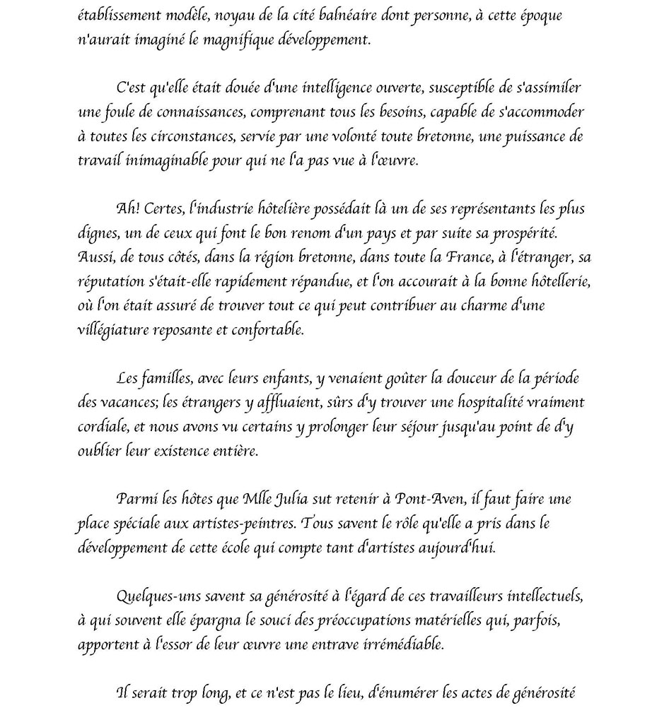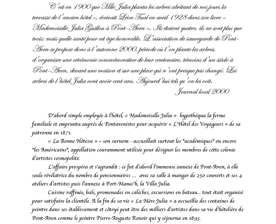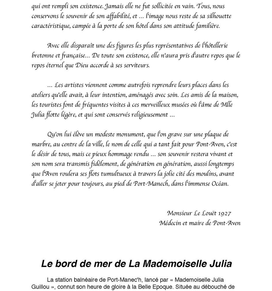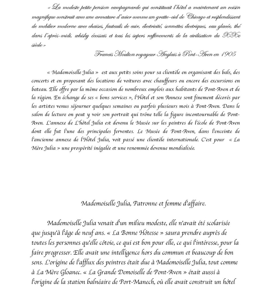 MADEMOISELLE JULIA GUILLOU® (1848-1927) Pont-Aven Bretagne La bonne hôtesse de l'Hôtel JULIA est née à Pont-Aven le 28 septembre 1848, elle y décèdera le 16 janvier 1927. Cette Grande Dame à qui Pont-Aven doit tant … Il est exceptionnel qu'un hommage soit rendu … mais la voix populaire ici parle plus haut que les usages, et c'est pour me faire son interprète, que je viens exprimer les sentiments de la foule qui m'entoure … Peu d'hommes, en effet, auront marqué leur passage dans l'existence par une œuvre aussi vaste que celle de cette femme. D'humble extraction, munie de moyens minimes à tous points de vue, elle est parvenue, par une activité vraiment extraordinaire, doublée d'une sorte d'intuition, à la réalisation de projets matériels considérés de son temps comme audacieux, plus encore, à la création d'une atmosphère particulière favorable à la floraison d'une école artistique, dont le nom, désormais, est inséparable de la petite cité de Pont-Aven. Quelle audace ne lui fallut-il pas, en effet, pour entreprendre … l'édification des vastes immeubles qui abritent l'hôtel auquel son nom est attaché, pour organiser dans un fortin perdu sur une pointe aride, au bord de l'Océan, un établissement modèle, noyau de la cité balnéaire dont personne, à cette époque n'aurait imaginé le magnifique développement. C'est qu'elle était douée d'une intelligence ouverte, susceptible de s'assimiler une foule de connaissances, comprenant tous les besoins, capable de s'accommoder à toutes les circonstances, servie par une volonté toute bretonne, une puissance de travail inimaginable pour qui ne l'a pas vue à l'œuvre. Ah! Certes, l'industrie hôtelière possédait là un de ses représentants les plus dignes, un de ceux qui font le bon renom d'un pays et par suite sa prospérité. Aussi, de tous côtés, dans la région bretonne, dans toute la France, à l'étranger, sa réputation s'était-elle rapidement répandue, et l'on accourait à la bonne hôtellerie, où l'on était assuré de trouver tout ce qui peut contribuer au charme d'une villégiature reposante et confortable. Les familles, avec leurs enfants, y venaient goûter la douceur de la période des vacances; les étrangers y affluaient, sûrs d'y trouver une hospitalité vraiment cordiale, et nous avons vu certains y prolonger leur séjour jusqu'au point de d'y oublier leur existence entière. Parmi les hôtes que Mlle Julia sut retenir à Pont-Aven, il faut faire une place spéciale aux artistes-peintres. Tous savent le rôle qu'elle a pris dans le développement de cette école qui compte tant d'artistes aujourd'hui. Quelques-uns savent sa générosité à l'égard de ces travailleurs intellectuels, à qui souvent elle épargna le souci des préoccupations matérielles qui, parfois, apportent à l'essor de leur œuvre une entrave irrémédiable. Il serait trop long, et ce n'est pas le lieu, d'énumérer les actes de générosité qui ont rempli son existence. Jamais elle ne fut sollicitée en vain. Tous, nous conservons le souvenir de son affabilité, et … l'image nous reste de sa silhouette caractéristique, campée à la porte de son hôtel dans son attitude familière. Avec elle disparaît une des figures les plus représentatives de l'hôtellerie bretonne et française… De toute son existence, elle n'aura pris d'autre repos que le repos éternel que Dieu accorde à ses serviteurs. … Les artistes viennent comme autrefois reprendre leurs places dans les ateliers qu'elle avait, à leur intention, aménagés avec soin. Les amis de la maison, les touristes font de fréquentes visites à ces merveilleux musées où l'âme de Mlle Julia flotte légère, et qui sont conservés religieusement … Qu'on lui élève un modeste monument, que l'on grave sur une plaque de marbre, au centre de la ville, le nom de celle qui a tant fait pour Pont-Aven, c'est le désir de tous, mais ce pieux hommage rendu … son souvenir restera vivant et son nom sera transmis fidèlement, de génération en génération, aussi longtemps que l'Aven roulera ses flots tumultueux à travers la jolie cité des moulins, avant d'aller se jeter pour toujours, au pied de Port-Manech, dans l'immense Océan. Monsieur Le Louët 1927 Médecin et maire de Pont-Aven Le bord de mer de La Mademoiselle Julia La station balnéaire de Port-Manec'h, lancé par « Mademoiselle Julia Guillou », connut son heure de gloire à la Belle Epoque. Située au débouché de l'Aven, l'une de ces rivières bretonnes qui respire au rythme des marées, Port-Manec'h vécut longtemps de la pêche à la sardine. De belles propriétés côtoient les maisons de pêcheur d'autrefois. A la fin du XIXe siècle, l’artiste Paul Gauguin, qui résidait à Pont-Aven, à 15 km de là, venait peindre au bord de l'océan des toiles dont certaines sont devenues célèbres. Comme nous le raconte Caroline Boyle-Turner, historienne d’art américaine tombé fou amoureuse de ce petit coin de Bretagne. "Gauguin représentait des pêcheurs et des femmes en coiffe ; il aimait croire que toutes les femmes du coin s'habillaient ainsi" Le docteur Barnes (1872-1951), grand collectionneur américain, y séjourna pendant de nombreux étés, séduit par la présence des peintres de Pont-Aven et par la beauté des paysages. Les premiers estivants ont découvert Port-Manec'h en 1906, sur les pas des artistes. La truculente Julia Guillou, propriétaire du luxueux Hôtel des Voyageurs à Pont-Aven, venait d'inaugurer « Chez Julia », une annexe de son établissement, à côté du phare. Jean Gabin, Arletty y séjournèrent. Les cartes postales de l'époque montrent une bâtisse assez rugueuse, style fortin, à un seul étage. "Chaque jour, on y livrait deux tonneaux d'eau douce sur une charrette tirée par des chevaux ». « Mademoiselle Julia » a su tirer partie de cette manne financière dans le lancement de la station balnéaire Port-Manec’h. Certes « La Bonne Hôtesse » avai